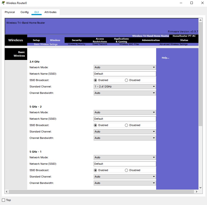 On the Wireless tab under the Basic Wireless Settings sub-tab, the only settings you can change are the Network Name (SSID) and the Standard Channel for each radio band.
