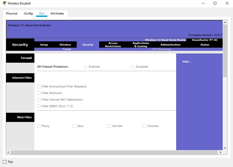 The GUI tab offers the same configurations and settings as the Config tab with some additional features for access restrictions, ISP VLAN setup, port forwarding, DMZ access, administration, as well as router and network status. Make sure you click on the Save Settings button at the bottom to apply the new settings to the Home Router before going to any other tab.