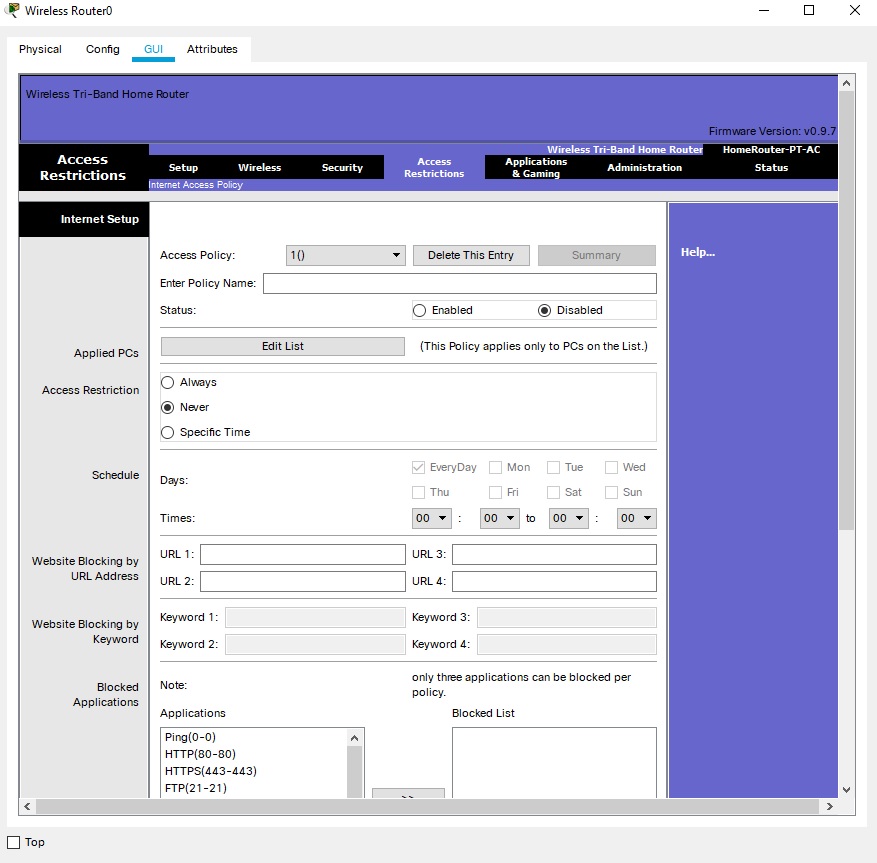 On the Access Restrictions tab under the Internet Access Policy sub-tab, you can apply various access restrictions policies on the connected hosts. To add a policy to the router, first select a policy you would like to edit from the Access Policy drop-down menu and then Enter a Policy Name for the policy. Then, set the Status to Enabled. Next, click on the Edit List button and enter the host IP addresses you would like to apply the policy on in the List of PCs dialog that shows up. After editing the list, click on Save Settings and Close inside the dialog. Back in the GUI, select Deny to restrict all applications or select Allow for specific application access restriction. If you select Allow, you can choose up to three applications to block. To block an application, select the application from the Applications list and click on the >> button to add it to the Blocked List. To unblock an application, select the application from the Blocked List and click on the << button. If you want to remove a policy, select the policy from the Access Policy drop-down menu and click Delete This Entry. The restrictions configured on this page can also be applied on schedule by setting from and to times of the day in the Schedule sub-section of the page. Time values refer to the Environment clock displayed in the top -right corner of the application's main window. Using this feature allows for all configured restrictions to take place only within the time frame specified.
