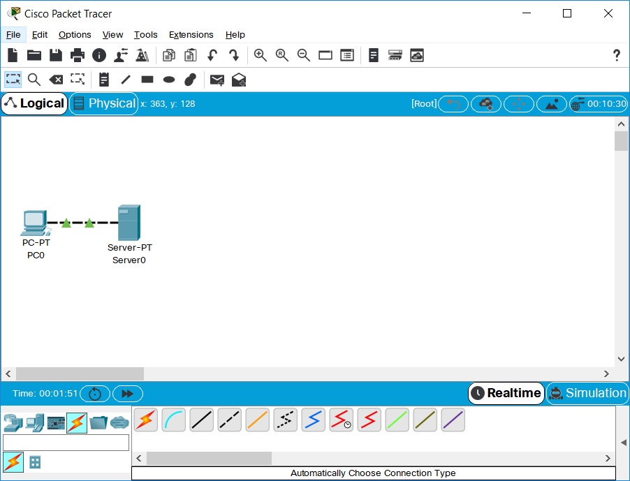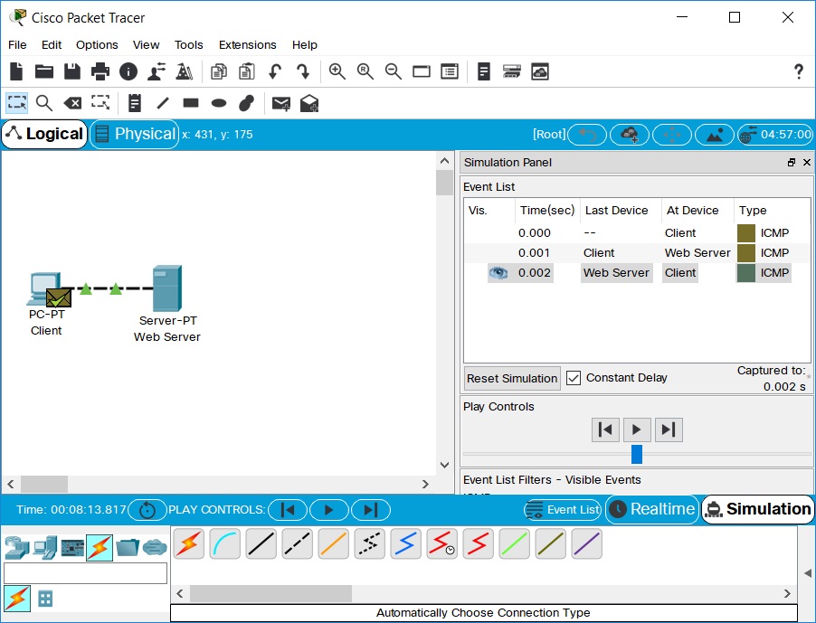 请注意,单击“播放”后,工作空间中的数据包将从一台设备移动到另一台设备(这是从PC到服务器的ICMP回显请求消息)。