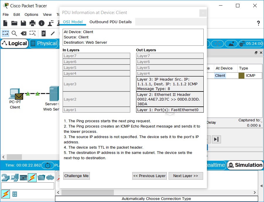 3. Use the Next Layer and Previous Layer buttons to see details of the packet processing at the relevant OSI layers. Note that only the Out Layers can be viewed in the case of this original echo request message.